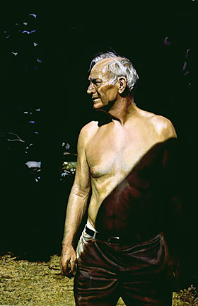Intrigued by what he refers to as “the patina of life,” the artist often paints pictures that celebrate the proof of time’s effects. “I’m intrigued by the passage of time,” he says, “and the evidence of that passage on people or objects.” In works such as Cracked Rib, The Silent Ax and Mare’s Tail, retired objects assume primacy in their respective compositions, while Gutted and Bone Dry pay homage to vacant structures beyond the point of usefulness. If the figures shown in Reds and Family Man seem similarly timeworn, there is perhaps in these paintings an even deeper feeling of reverence, of respect. Rather than fearing the passage of time, as many of us do, Wiltraut embraces it. “Most people don’t enjoy getting older,” he says, “and they realize as they do get older that time starts to go by more quickly.” By celebrating the wisdom and life experience that comes with age, the artist manages to achieve quiet compositions that resist melancholy. “There’s a beauty to the passage of time and the effects it has on objects and people,” Wiltraut says. “Timeworn textures, a face with a story to tell, the patina of life are all things I like to portray. The passage of time is something we all have to deal with. I almost always paint these objects and people in a strong, raking sunlight with elongated shadows, which results in what I refer to as a ‘special visual moment,’ a moment when the ordinary is elevated to something memorable.” Process In order to paint light at night, Wiltraut uses a sketch or a photograph to record the shape of a cast shadow. He doesn’t see working this way as a hindrance, since the lighting situations he paints are fleeting anyway. Very often, the artist says, he brings objects he’s painting into his studio to create a modified version of his scene indoors to work from, and he uses “instinctive composition” to design his paintings. “When something looks right,” he notes, “it usually is.” For works that contain figures, such as Family Man or Looking at the Moon, Wiltraut begins with the face and skin. “I try to get the facial area fairly close to what I want it to look like before proceeding to the other areas,” he says. “If the face doesn’t turn out right, what’s the point?” Using the English watercolor method, Wiltraut brushes a clear passage of water over the chosen area of skin first before applying a single color to this newly wet spot. After the color dries, a second passage of clear water and a second color are introduced to the same area of the paper. This process continues, layer by layer, until the desired pastel-like skin tone results, he says. Textures and details are added later to these layers with drybrush techniques. Although he sometimes employs a background wash first, Wiltraut usually works around the near-finished figure with a wet-on-dry approach. “When the background value is established to the darkness that I want, I will then go back to the face or figure until I bring the face and background into balance,” the artist says. “Because I love to depict a strong sunlight, my ‘balance’ really is an exaggeration of the values, because it’s that exaggeration that ‘brings the sun out.’ ” Believing that dark passages without detail can flatten rather than enhance a painting with a cast shadow, Wiltraut takes extra care to include intricate detail work in his shadows. “It’s critically important to include details within the shadowed areas to create an illusion of reality,” he says. “When you peer into a dark shadow you can still see things.” Meaning
